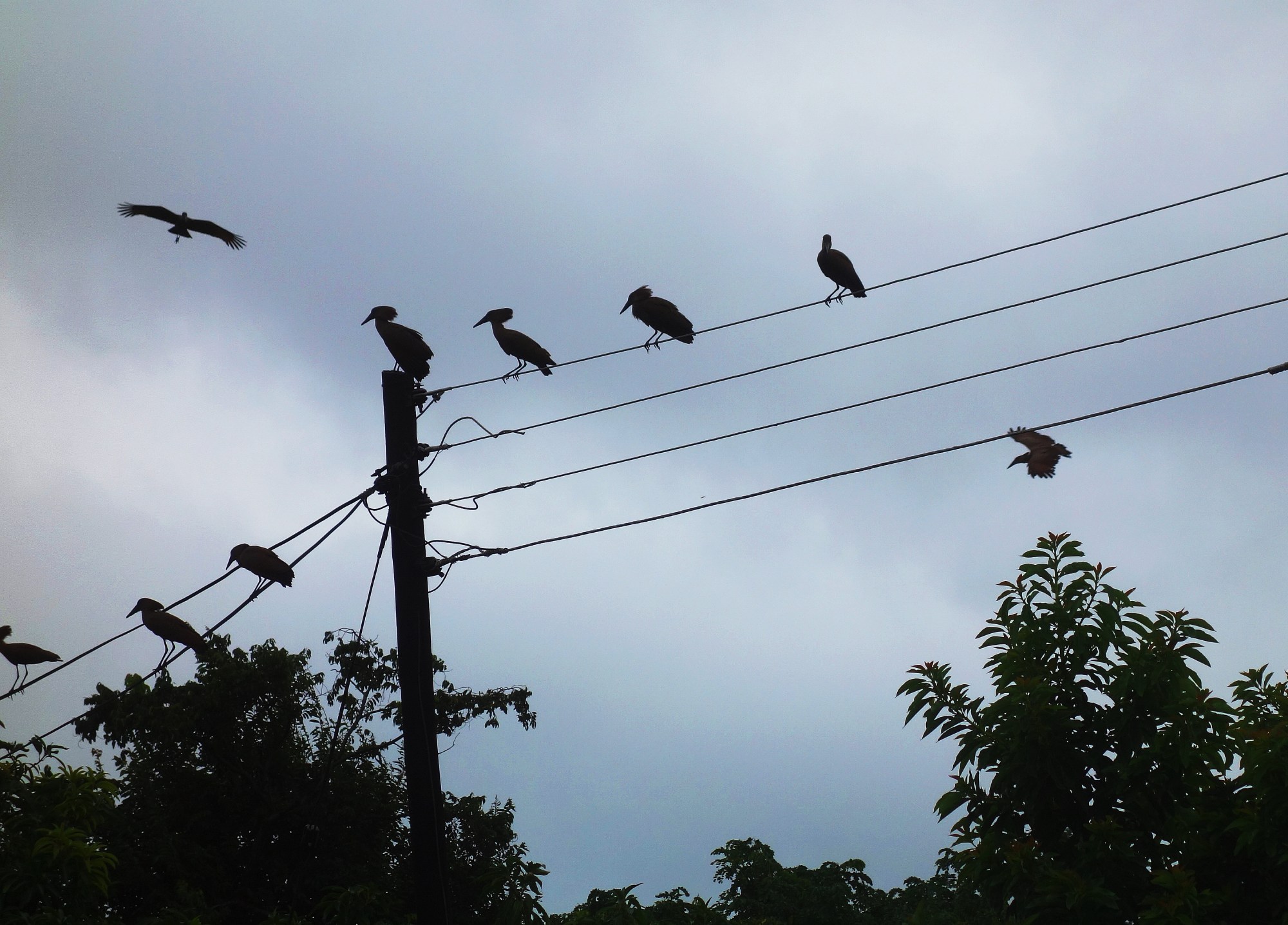 [Above photo: A flock of Hammerkops on our wires—no albatrosses here!]