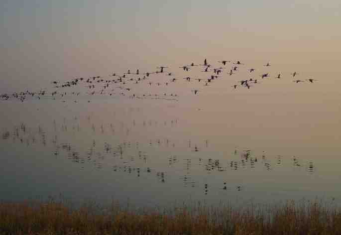 [Above photo: Flamingos at dusk in Nata Bird Sanctuary, Ntwetwe Pan, Botswana. ]