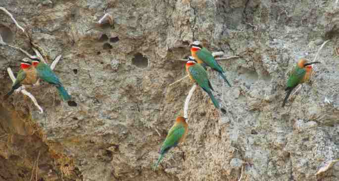 [Above photo: White-fronted Bee-Eaters, bank-nesters, on the Zambezi River]