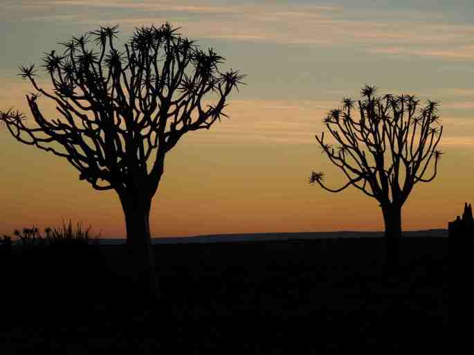 [Above photo: Two giant quiver trees (aloe) at sunrise, Fish River Canyon Lodge, Namibia]