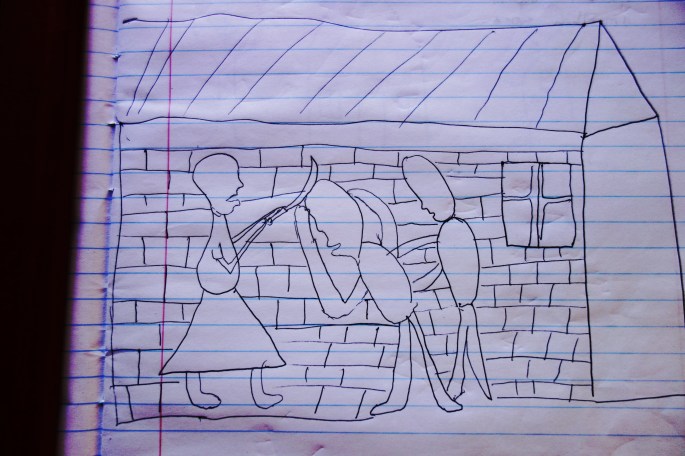 [Above photo: The tree-house-person drawing by a castrated boy. “The man is going to kill his dog because the dog has been killing the chickens.”]